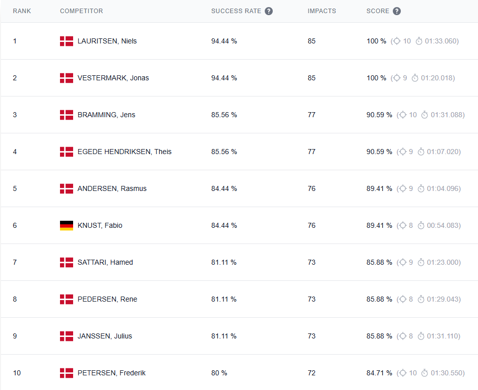 1. Niels Lauritsen – 94,44 % (85 træf)